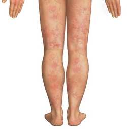Piel: Lesiones variables: nódulos, reticulado, lesiones ulceradas, lesiones necróticas, purpuras palpables tanto en miembros superiores como inferiores.